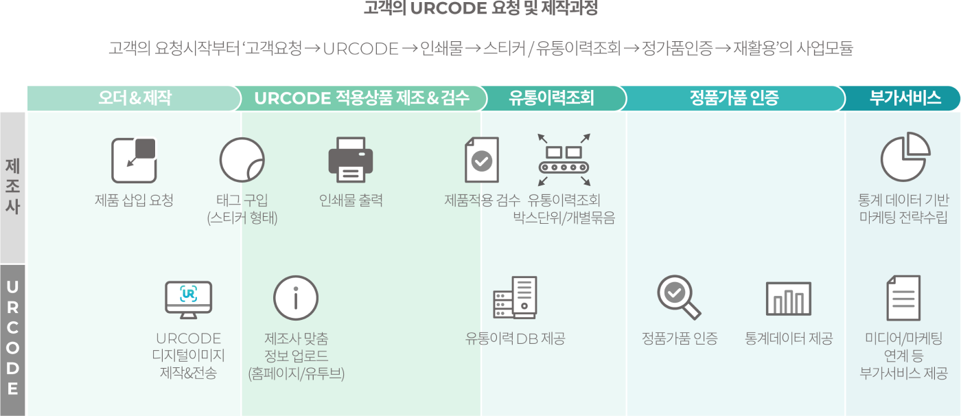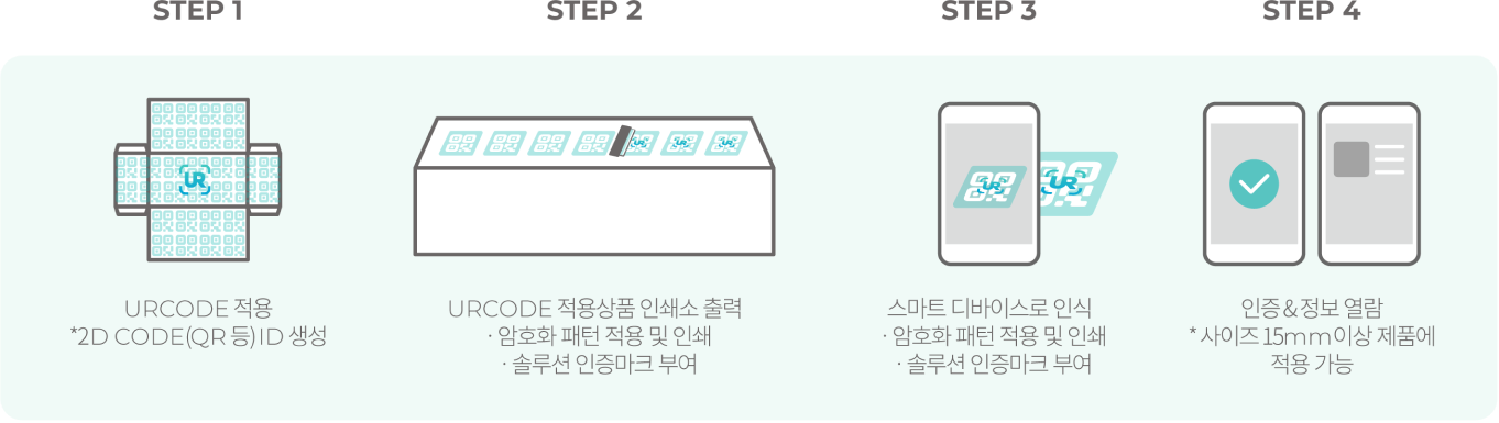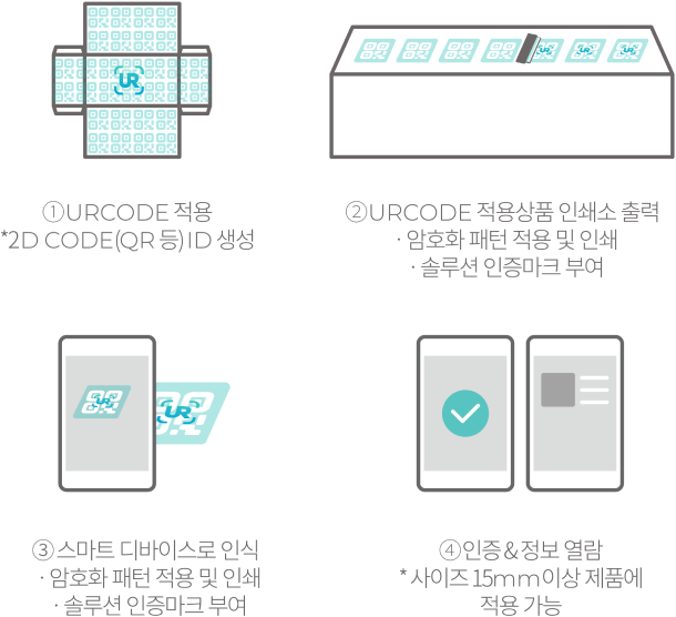 인터렉티브 정품인증 (정가품 판별) 암호화 패턴이 적용된 제품 구매 후 스마트폰으로 누구나 손쉽게 정품인증 및 상세정보 확인 가능 인터렉티브 정품인증 (정가품 판별) 암호화 패턴이 적용된 제품 구매 후 스마트폰으로 누구나 손쉽게 정품인증 및 상세정보 확인 가능 HOW IT WORKS? HOW IT WORKS? PROCESS PROCESS 고객의 요청시작부터 ‘고객요청→URCODE→인쇄물→스티커/유통이력조회→정가품인증→재활용’의 사업모듈 CONTACT US Name Email Subject Company Message CONTACT US Name Email Subject Company Message